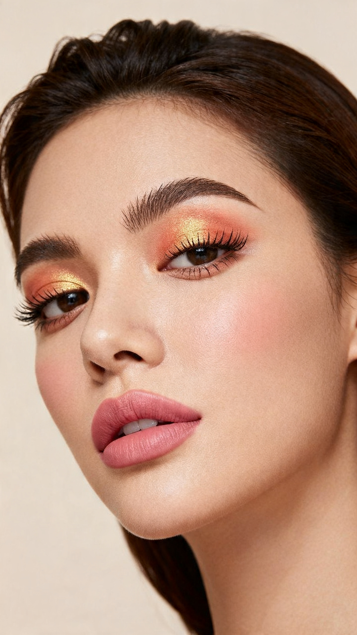 - Step 4: Finish with soft beige satin lips and a little warm blush.